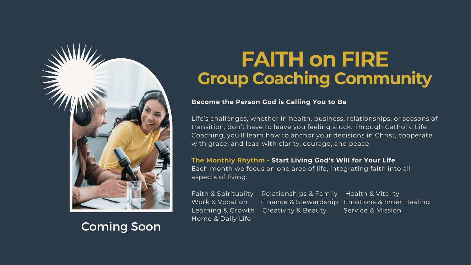 Chose transformation through Private Catholic Coaching or the Group Coaching Community, both designed to help you live your faith with conviction, clarity, and impact. Each week blends Church teaching, guided reflection, and prayer-led coaching to draw you deeper into intimacy with Christ and align your life with His mission. You’ll strengthen your daily walk through practices such as conviction, repentance, intercession, and obedience, while learning to actively recognize and respond to the Gifts, Fruits, and promptings of the Holy Spirit in your everyday decisions.